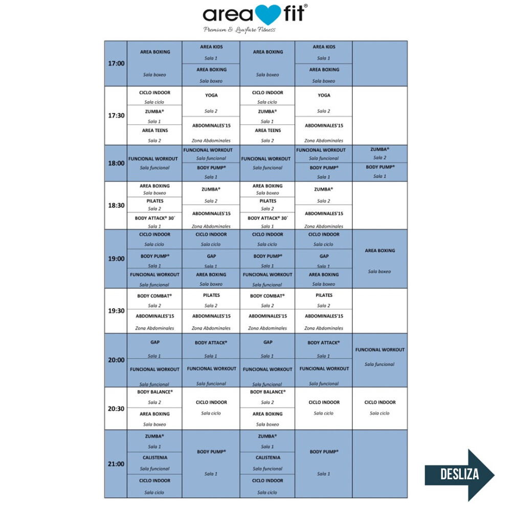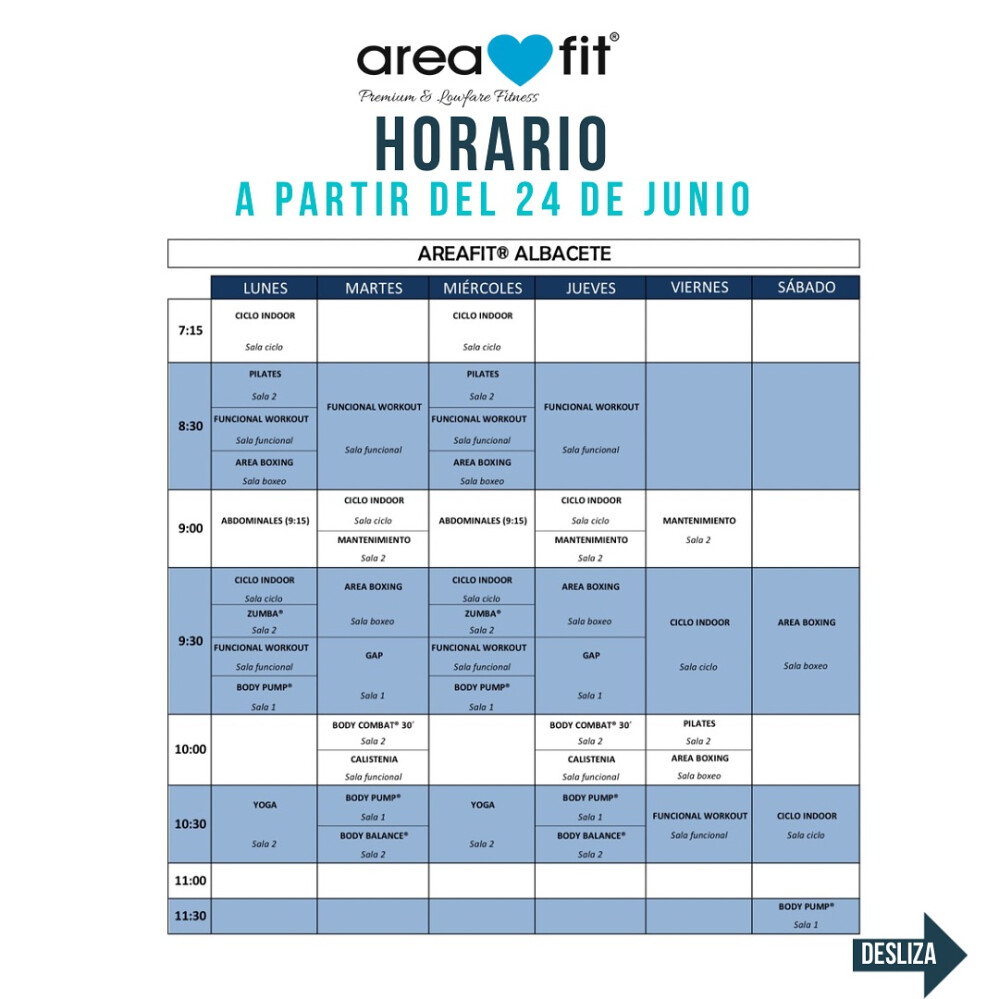 Sedes de AreafitEn Areafit Albacete se ofrecen actividades como Abdominales, BODYATTACK ®, BODYBALANCE ®, BODYCOMBAT ®, BODYPUMP ®, GAP, Zumba, Calistenia, CrossFit, Entrenamiento funcional, Pilates, Indoor Cycle, Yoga, Boxeo, Musculación y Cardio.