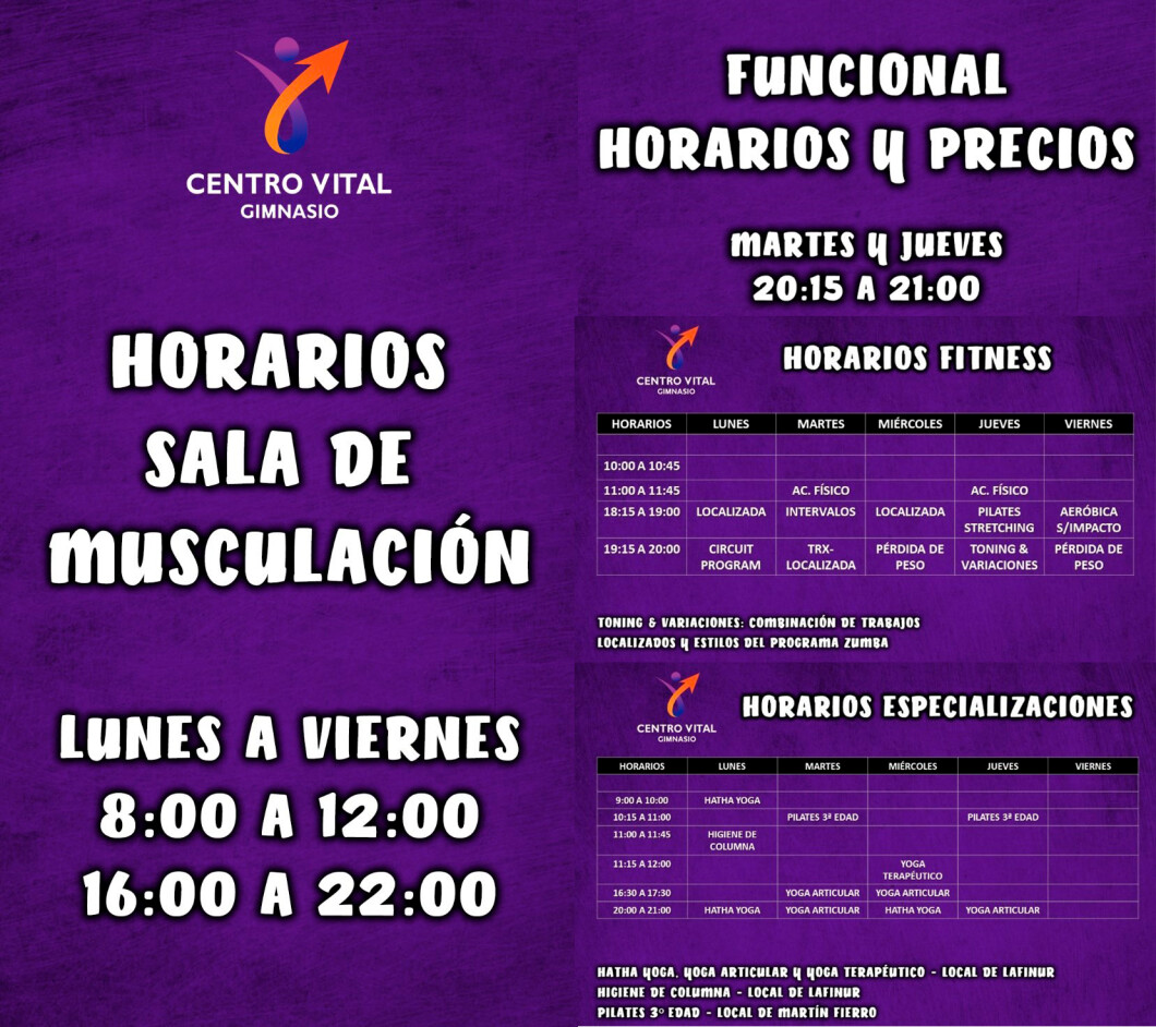 En Centro Vital Martín Fierro se ofrecen actividades como Acondicionamiento Físico, Aerobics, Circuit Training, Gimnasia Localizada, Stretching, Entrenamiento funcional, TRX, Pilates, Pérdida de peso, Musculación y Cardio.
