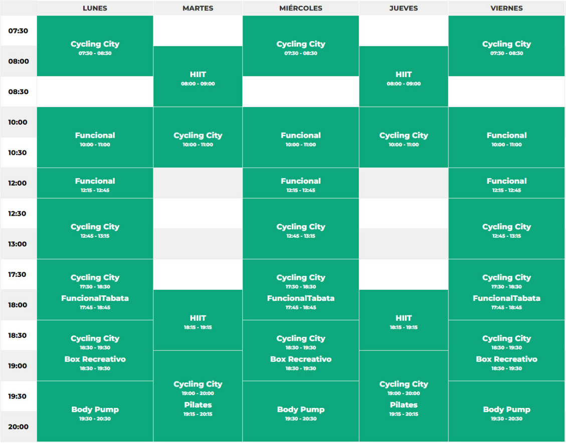 En City Fitness Ciudad Vieja se ofrecen actividades como BODYPUMP ®, Cardiobox, Tabata, Cross Training, Entrenamiento funcional, Pilates, Cycle, Indoor Cycle, Musculación y HIIT.