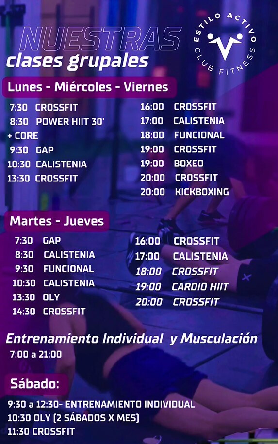 En Estilo Activo Club Fitness se ofrecen actividades como GAP, Calistenia, CrossFit, Entrenamiento funcional, Boxeo, Kick Boxing, Musculación, HIIT, Cardio y Entrenamiento personalizado.