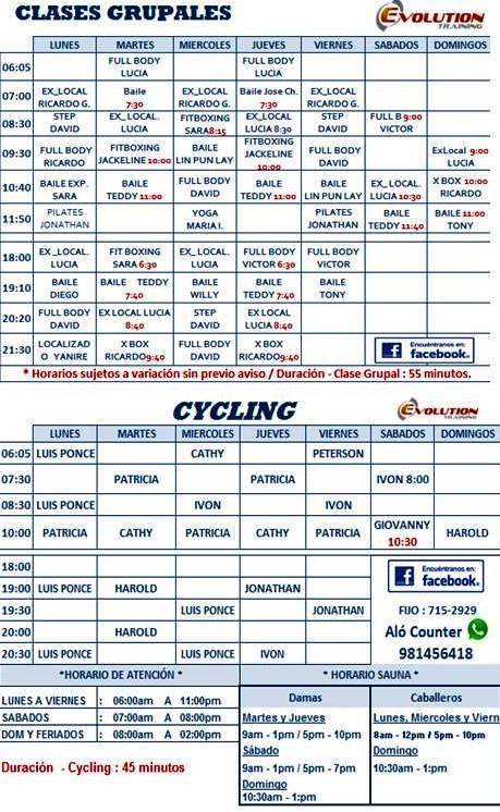 En Evolution Training se ofrecen actividades como Abdominales, Acondicionamiento Físico, Reggaeton, Ritmos latinos, Ritmos urbanos, Entrenamiento funcional, Cycle, Spinning, Musculación y Full Body.