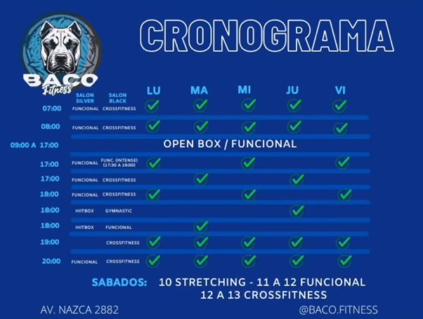 En Familia SportClub Baco Fitness Villa Del Parque se ofrecen actividades como Stretching, Cross Training, CrossFit, Entrenamiento funcional, Musculación y HIIT.