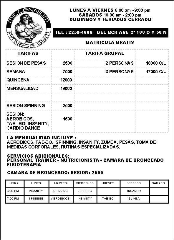 En Gimnasio Millennium se ofrecen actividades como Aerobics, Zumba, Spinning y Tae-bo.