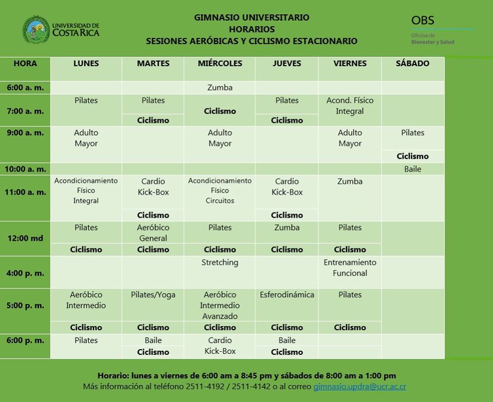 En Gimnasio UCR se ofrecen actividades como Acondicionamiento Físico, Aerobics, Cardiobox, Zumba, Pilates, Cycle y Yoga.