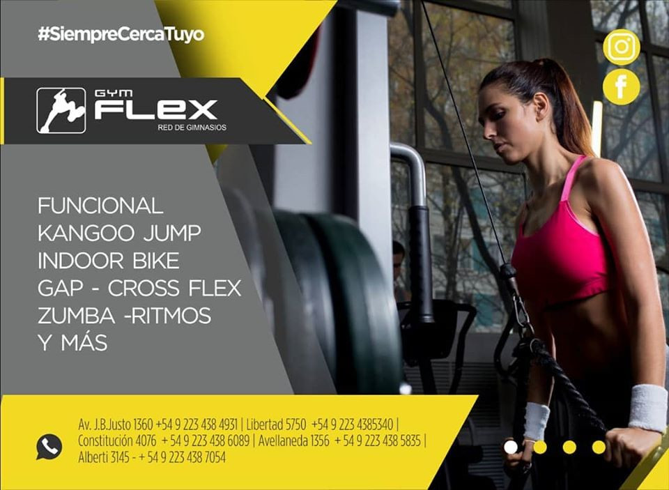 En Gym Flex se ofrecen actividades como GAP, Kangoo Jumps, Zumba, Ritmos latinos, Entrenamiento funcional, Indoor Bike, Kick Boxing y Musculación.