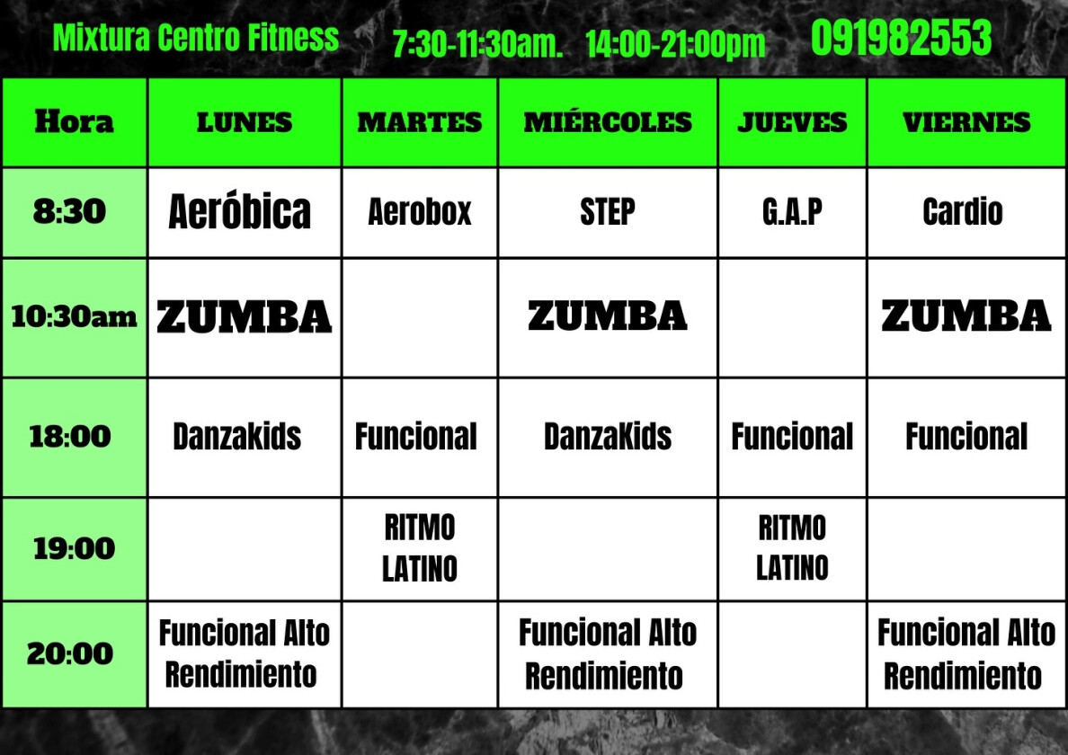 En Mixtura se ofrecen actividades como Aerobics, Aerobox, GAP, Step, Zumba, Ritmos latinos, Ritmos urbanos, CrossFit, Entrenamiento funcional, Musculación y Cardio.