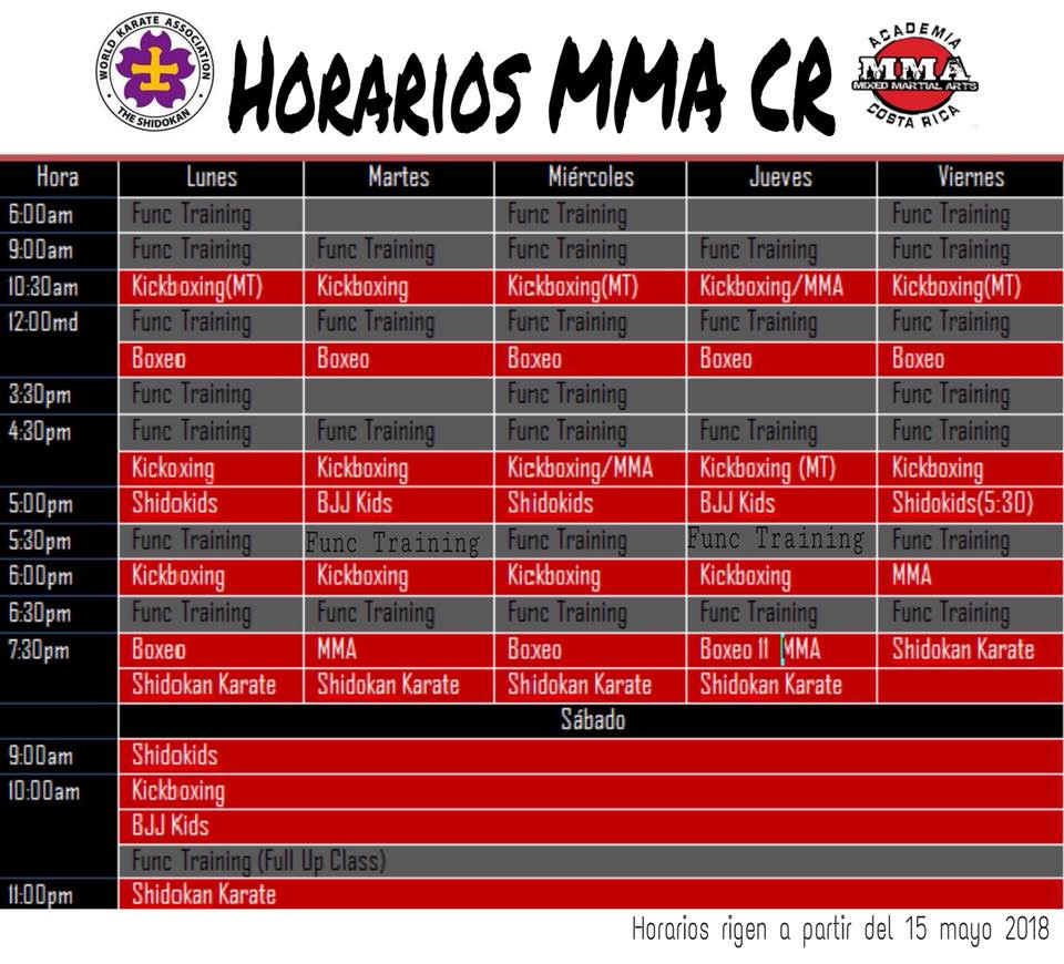 En MMA Costa Rica se ofrecen actividades como Entrenamiento funcional, Boxeo, Karate, Kick Boxing y MMA.