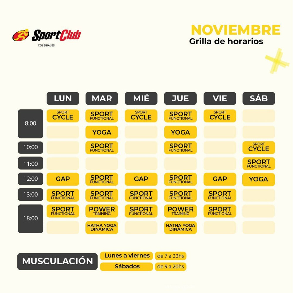 En SportClub Colegiales se ofrecen actividades como GAP, Entrenamiento funcional, Full Training, Indoor Cycle, Hatha Yoga, Yoga, Musculación y Cardio.