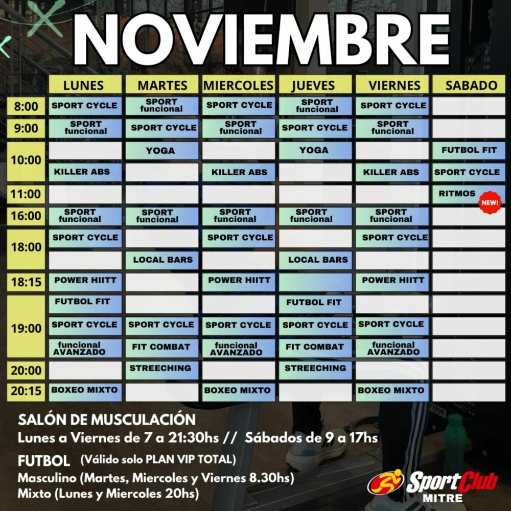 Sedes de SportClubEn SportClub Mitre se ofrecen actividades como Abdominales, Fit combat, Ritmos, Stretching, Entrenamiento funcional, Indoor Cycle, Yoga, Boxeo, Fútbol, Musculación, HIIT y Cardio.