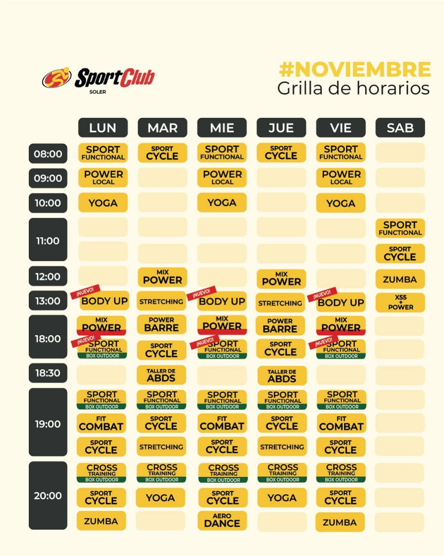 Sedes de SportClubEn SportClub Soler se ofrecen actividades como Abdominales, Aerodance, Fit Barre, Fit combat, Stretching, Zumba, Cross Training, CrossFit, Entrenamiento funcional, Indoor Cycle, Yoga, Entrenamiento al aire libre, Musculación y Cardio.