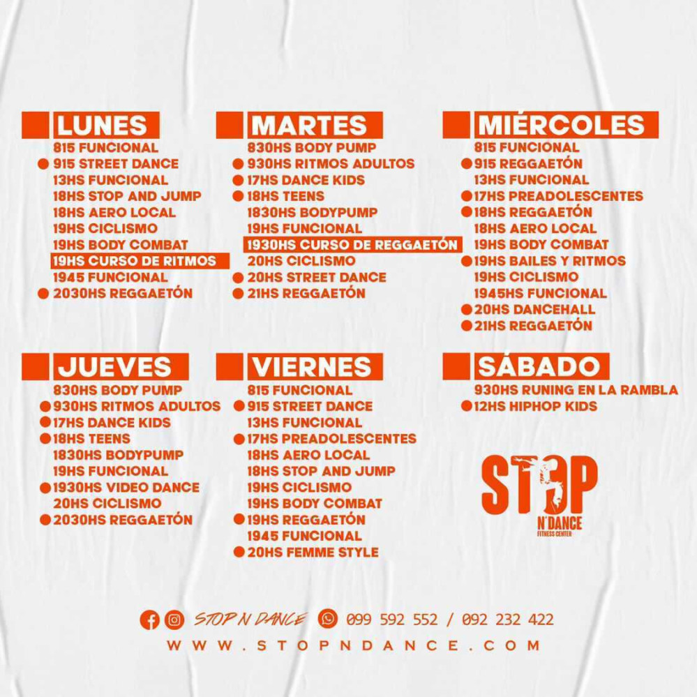 En Stop N'dance (Constituyente) se ofrecen actividades como BODYCOMBAT ®, BODYPUMP ®, Stretching, Zumba, Dancehall, Hip Hop, House dance, Reggaeton, Ritmos latinos, Salsa, Entrenamiento funcional y Cycle.